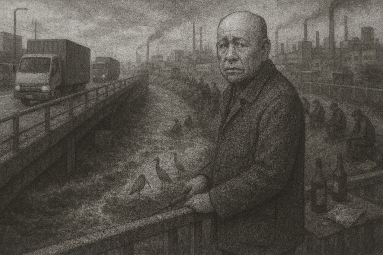 He was an old man who fished beside 30 others dangling a single line over a heavily trafficked bridge and had gone around 45 minutes without a drink of soju...